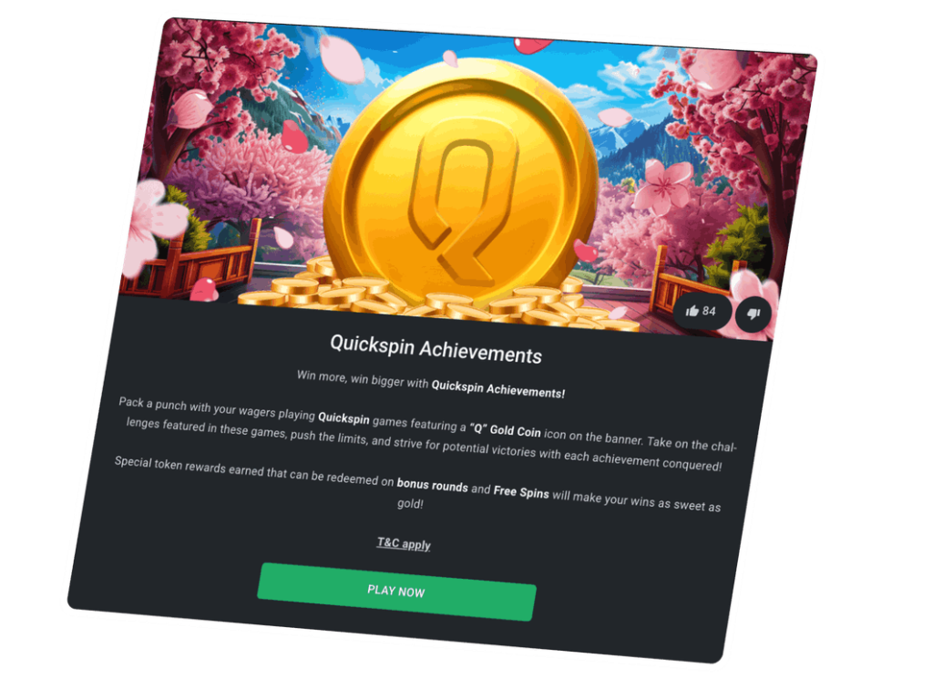 Τέλος, επωφεληθείτε από το Πρόγραμμα Επιτευγμάτων του Quickspin για να βελτιώσετε τα κέρδη σας. Τα οφέλη σας σίγουρα θα παραμείνουν με τη μορφή δωρεάν περιστροφών και ειδικών tokens.