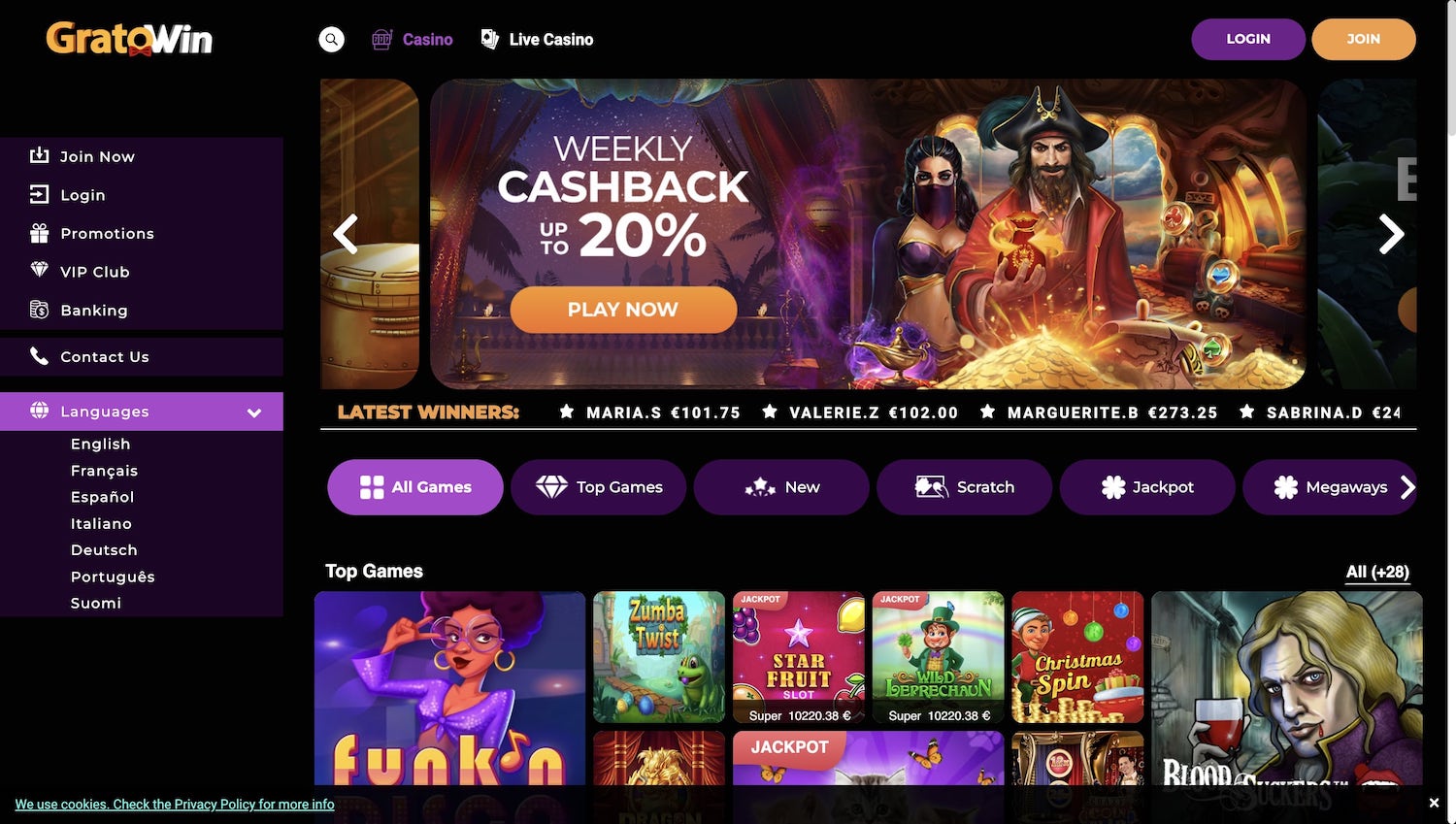La piattaforma si è guadagnata una reputazione per la sua ampia gamma di giochi e la navigazione intuitiva, e molti giocatori approdano sul sito quando cercano un'esperienza moderna e accessibile. Sia per i principianti che per i giocatori esperti, Gratowin mira a integrare un'interfaccia utente piacevole con una struttura di bonus competitiva e solidi partner software che garantiscono un'esperienza di gioco fluida su desktop e dispositivi mobili.